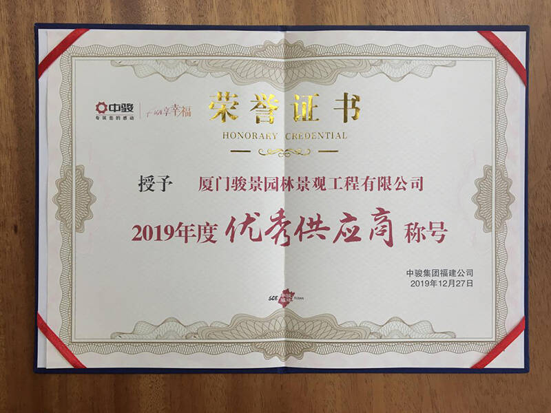 獲得(de)中駿集團福建公司“2019年(nián)度優秀供應商”稱号