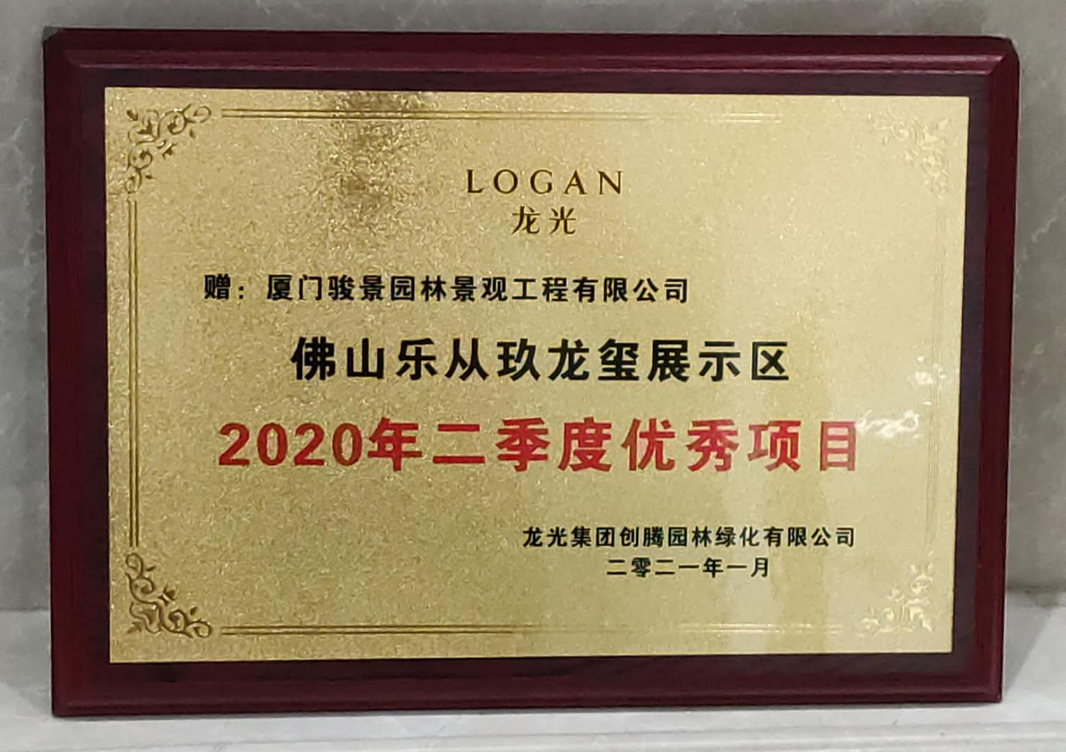 佛山(shān)樂(yuè)從(cóng)玖龍玺展示區(qū) 授予“2020年(nián)度季度優秀項目”